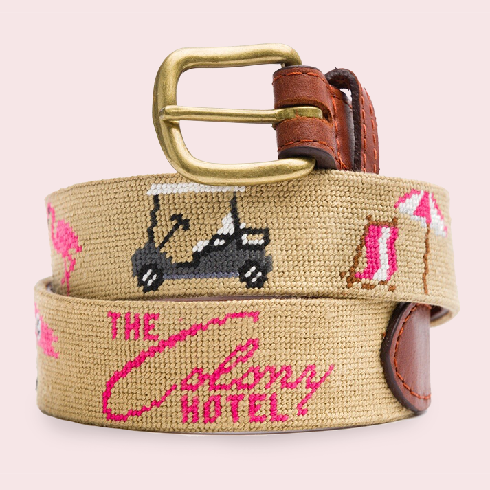 Smathers & Branson iconic needlepoint belt, as elegant as it is casual and fun, is the perfect accessory to help you stand apart from the crowd. This hand-stitched traditional belt is 1.25" in width and is finished with full grain, vegetable tanned Italian leather and a solid brass buckle. *Belts run small, please order one size larger than your normal size.